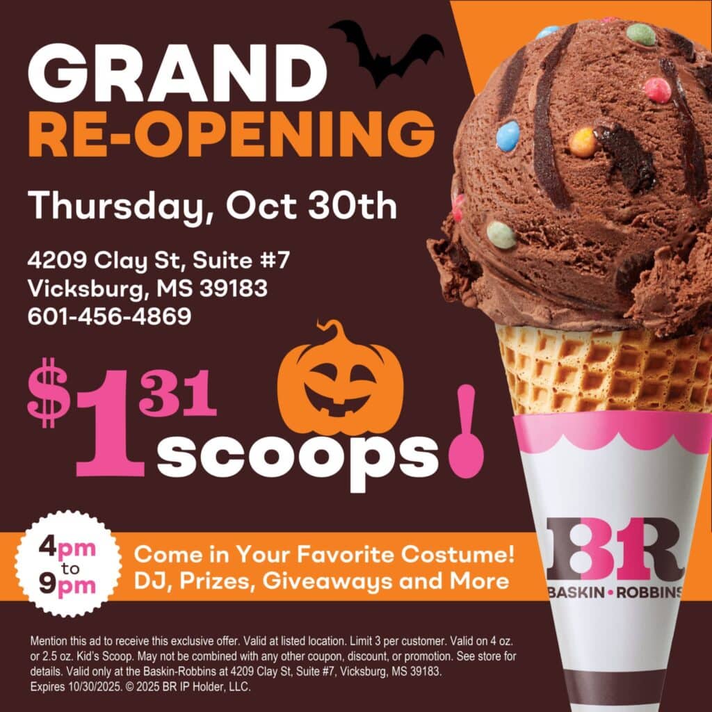 VICKSBURG, Miss. (VDN) — Baskin-Robbins is celebrating its grand reopening at 4209 Clay St., Suite #7, in Vicksburg with a Halloween-themed event this Thursday, Oct. 30, from 4 to 9 p.m. The ice cream shop will be offering $1.31 scoops during the celebration, along with music, prizes and giveaways.
