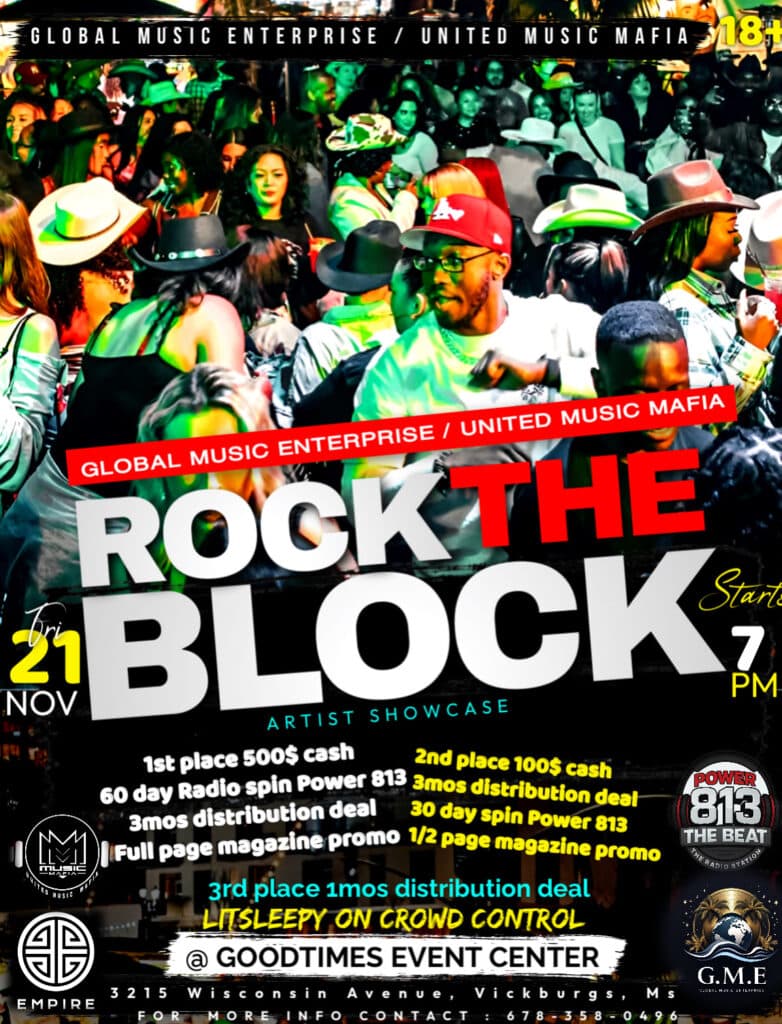 VICKSBURG, Miss. (VDN) — Local and regional artists will have the chance to hit the stage and compete for major prizes when Global Music Enterprise and United Music Mafia host the “Rock the Block” Artist Showcase on Friday, Nov. 21 at 7 p.m. at GoodTimes Event Center, 3215 Wisconsin Ave., Vicksburg.
