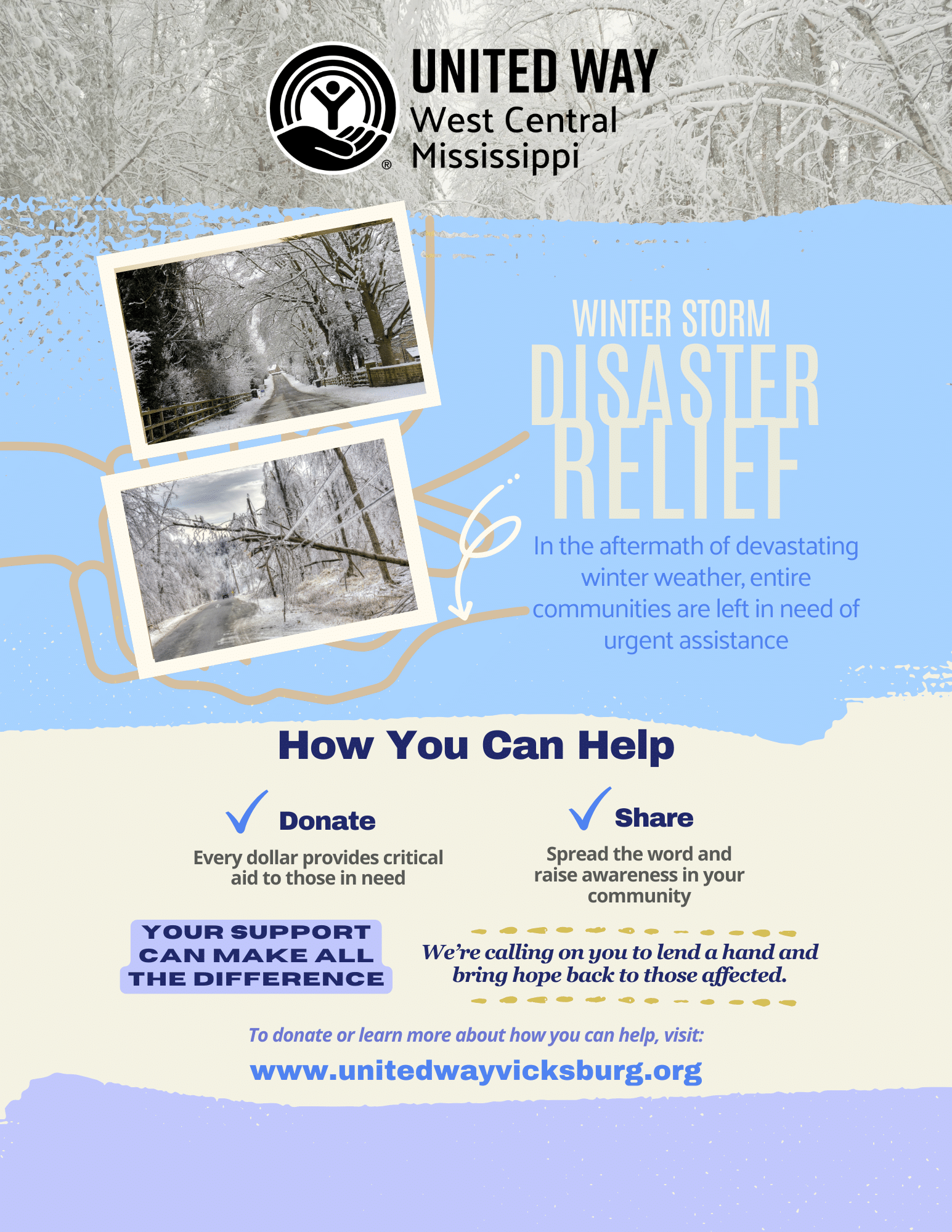 Community members are encouraged to support relief efforts by donating online at www.unitedwayvicksburg.org, clicking Donate, and selecting the 2026 Winter Storm Disaster Relief Fund under the Campaign. Contributions of any size can make an immediate difference for families affected by the winter storm.