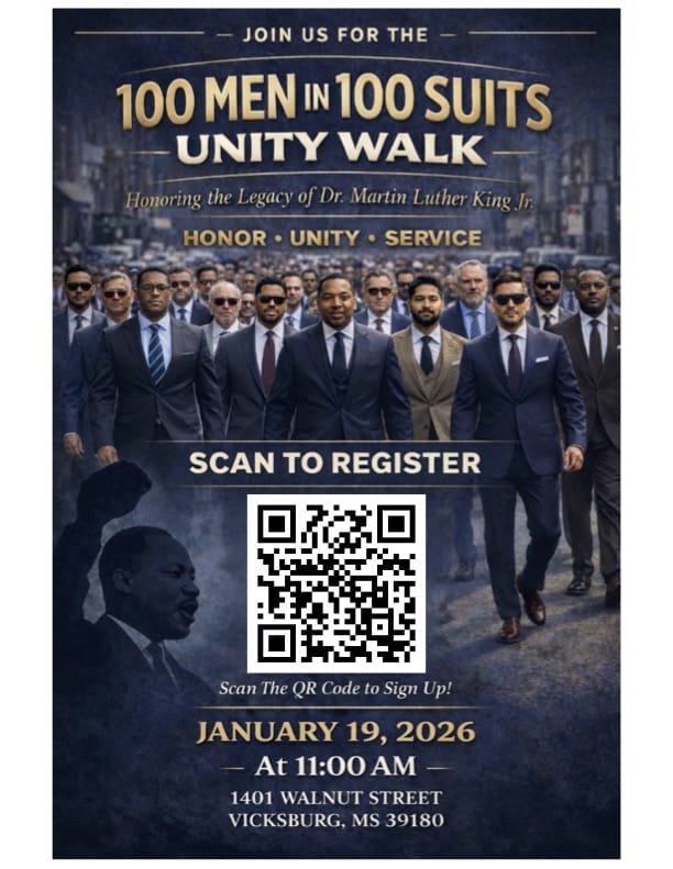VICKSBURG, Miss. (VDN) Sh’Vante Wiggins, City of Vicksburg Youth Service Coordinator, proudly announces the Dr. Martin Luther King Jr. Men’s Unity Day Walk, titled “100 Men in 100 Suits,” to be held on Monday, Jan. 19, 2026, in observance of Dr. Martin Luther King Jr. Day.