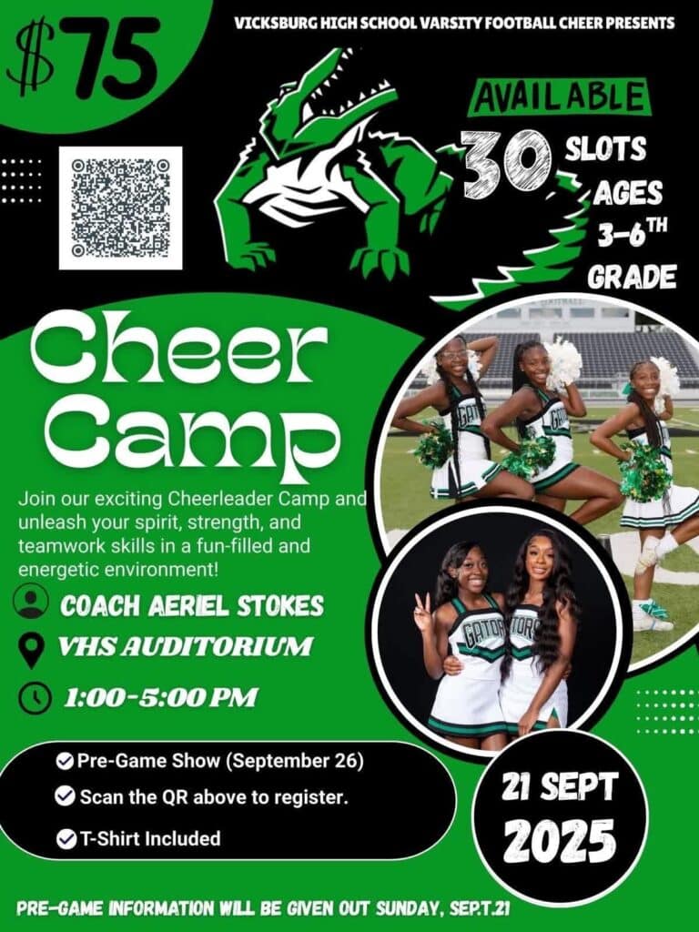 VICKSBURG, Miss. (VDN) — The Vicksburg High School Varsity Football Cheerleaders are hosting a cheer camp on Sept. 21 for elementary school students interested in learning cheerleading skills.