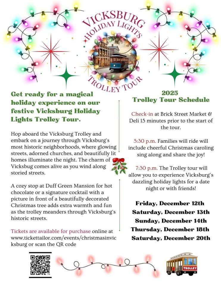 VICKSBURG, Miss. (VDN) — Vicksburg’s annual Holiday Lights Trolley Tour is set to return this December, offering families and visitors a festive way to enjoy the city’s historic charm. The popular holiday attraction invites guests to board the Vicksburg Trolley for a ride through some of the city’s oldest neighborhoods, where decorated homes, glowing streets and illuminated churches help bring the season to life.