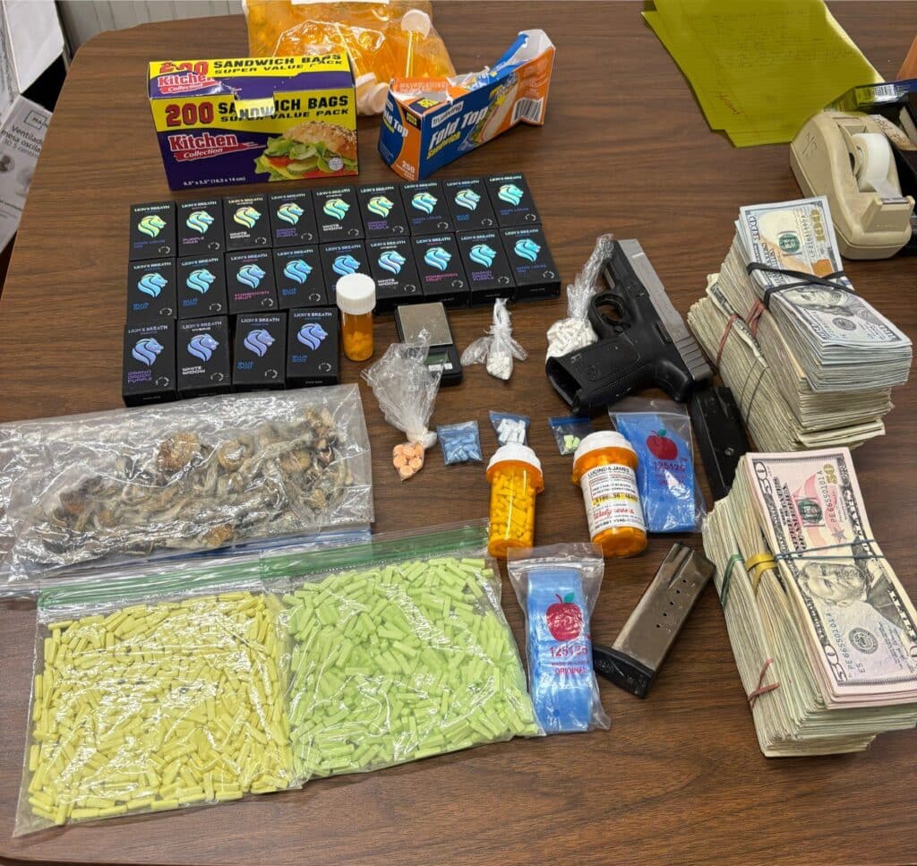 During the execution of the search warrant Investigators found over 1200 dosage units of Xanax tablets, 162 dosage units of Adderall, 3 grams of cocaine, 24 grams of Psilocin (Mushrooms), 22 vials of THC oil and a 40 caliber Smith and Wesson handgun.