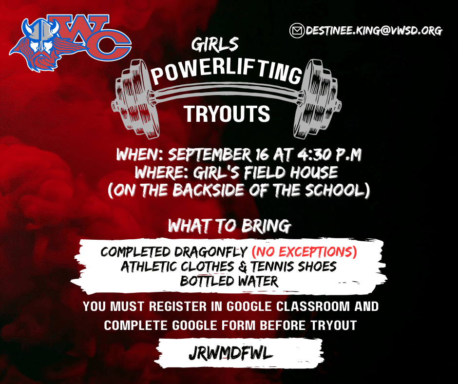 Athletes should bring athletic clothes, tennis shoes and bottled water. For more information, students may contact coach Destinee King at destinee.king@vwsd.org.